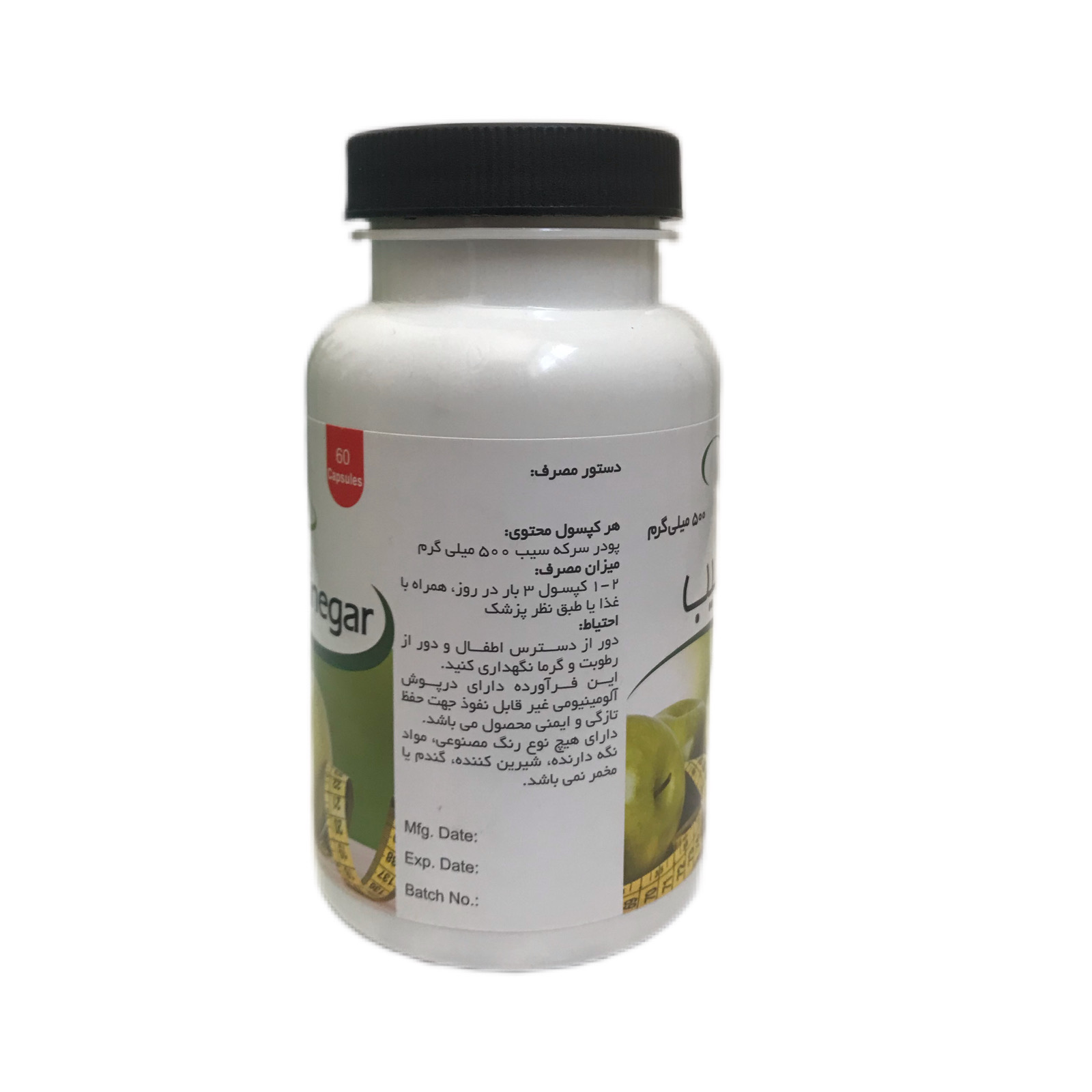 محتوی کپسول : هر کپسول محتوی پودر سرکه سیب 500 میلی گرم